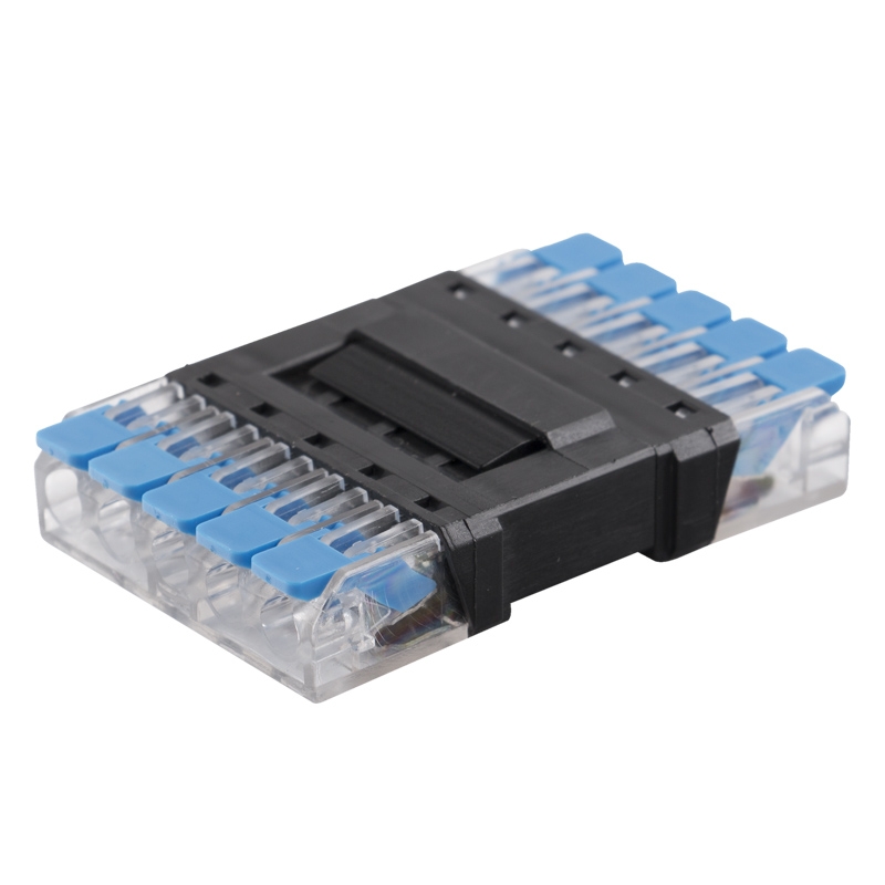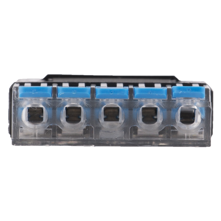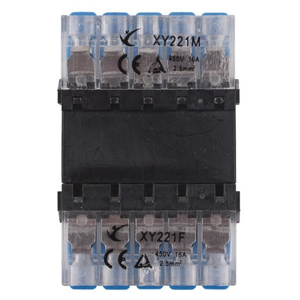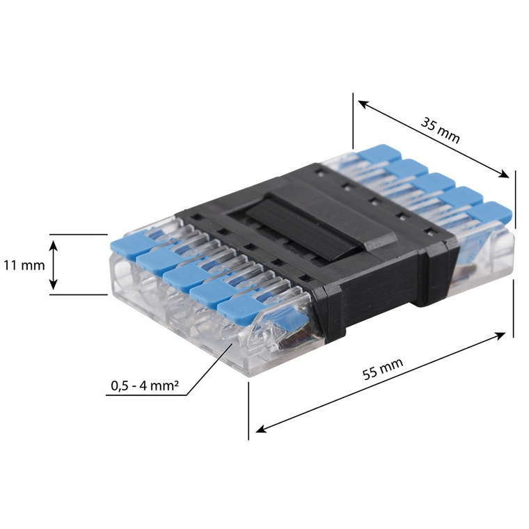 Konektor s páčkou pro snadné a rychlé připojení vodičů bez použití nástrojů. Pár vidlice + zásuvka, IP20, 5-pól, max. 250V/16A, pro kabely s průřezy 0,5-4mm². Rozměry ve spojeném stavu: 55x35x11mm.