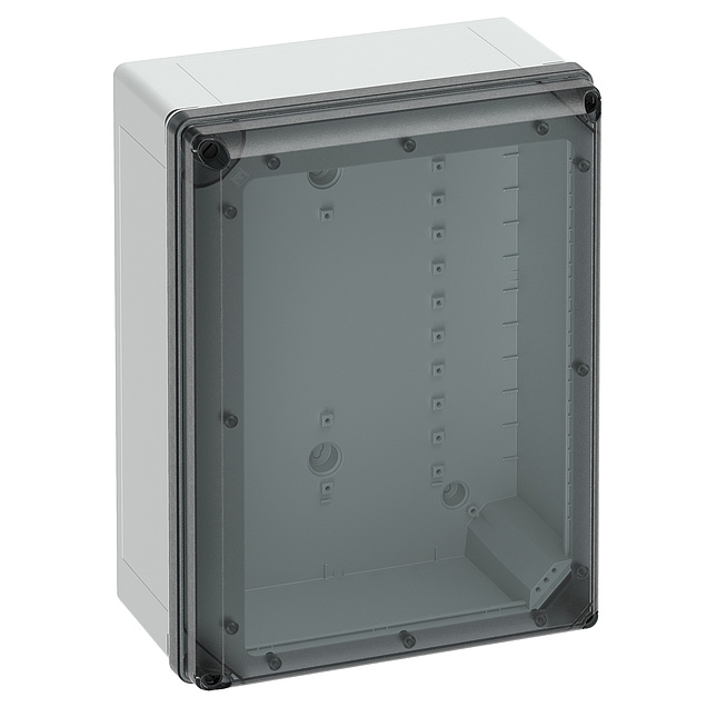Prázdná skříň, vhodná pro instalaci v náročných prostředích a exponovaných venkovních oblastech, základna: polykarbonát vyztužený skelnými vlákny, šedá, podobná RAL 7035, kryt: polykarbonát, s průhledným krytem, rozměry: 300 x 400 x 180 mm