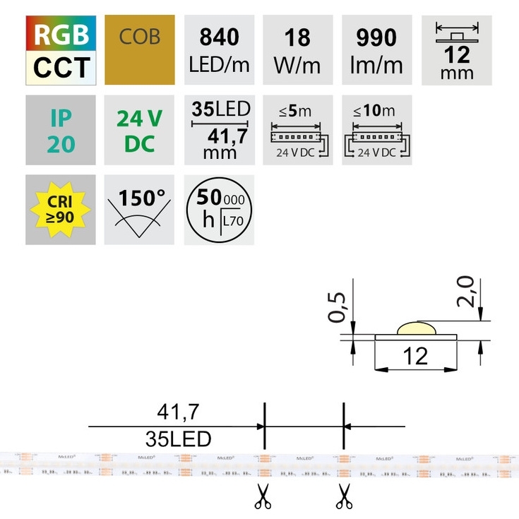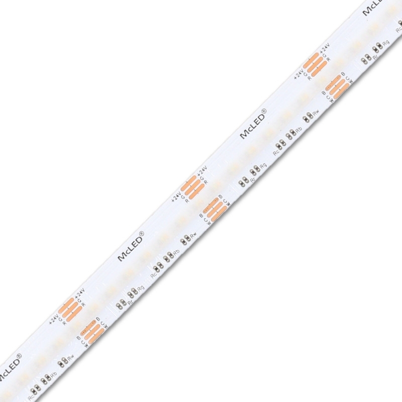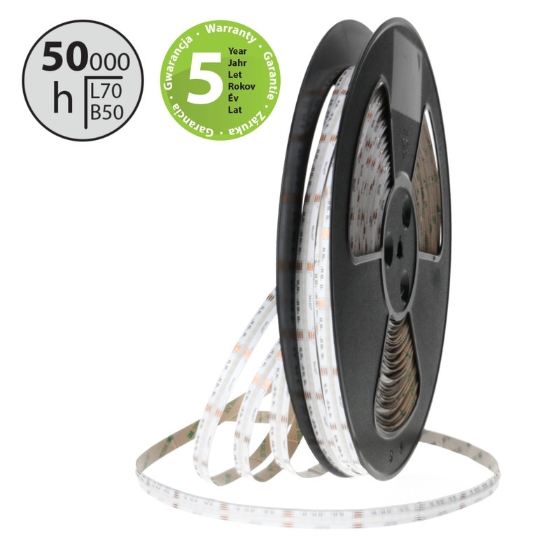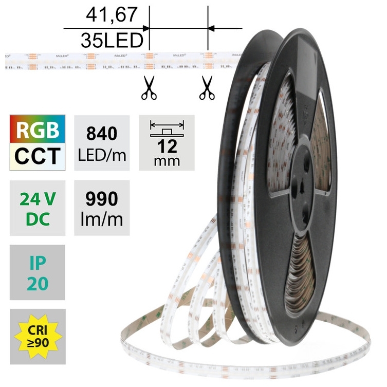 LED pásek COB, RGB + dual white CCT (2700-6300K), 18W, 840LED, 990lm/m, CRI>90, segment 41,7mm, 35LED/segment, IP20, DC 24V, životnost 50000h, šíře 12mm, bílý PCB pásek, max. délka pásku při jednostranném zapojení: 5m, opatřen samolepící páskou 3M, UV stabilní. Balení 50m.