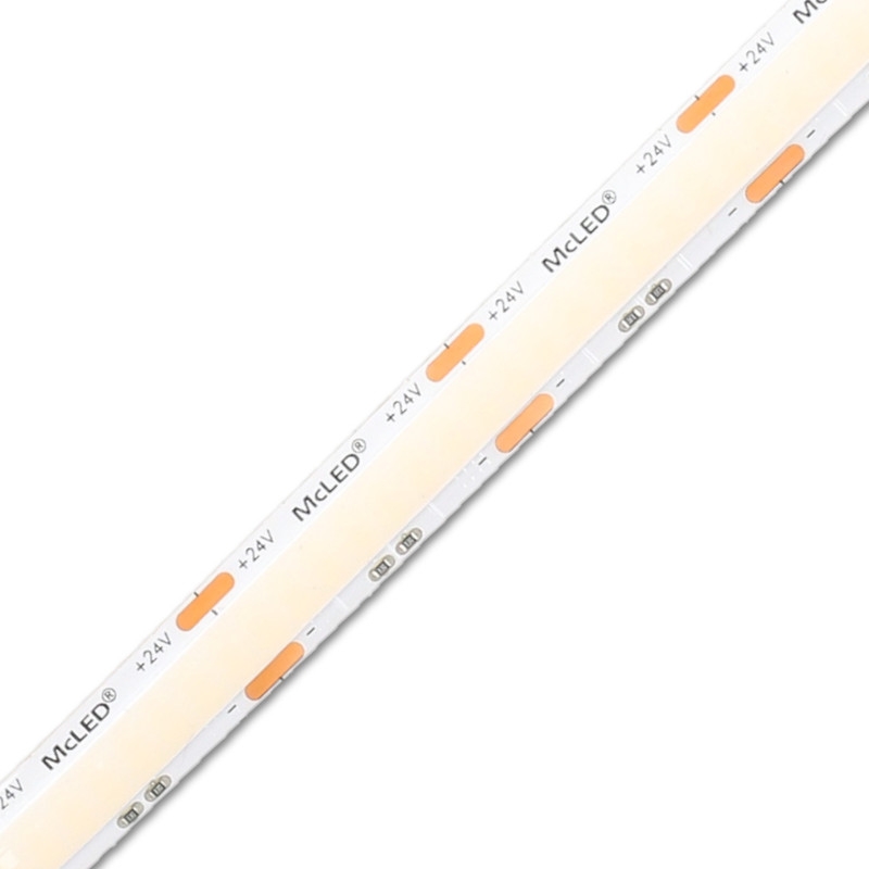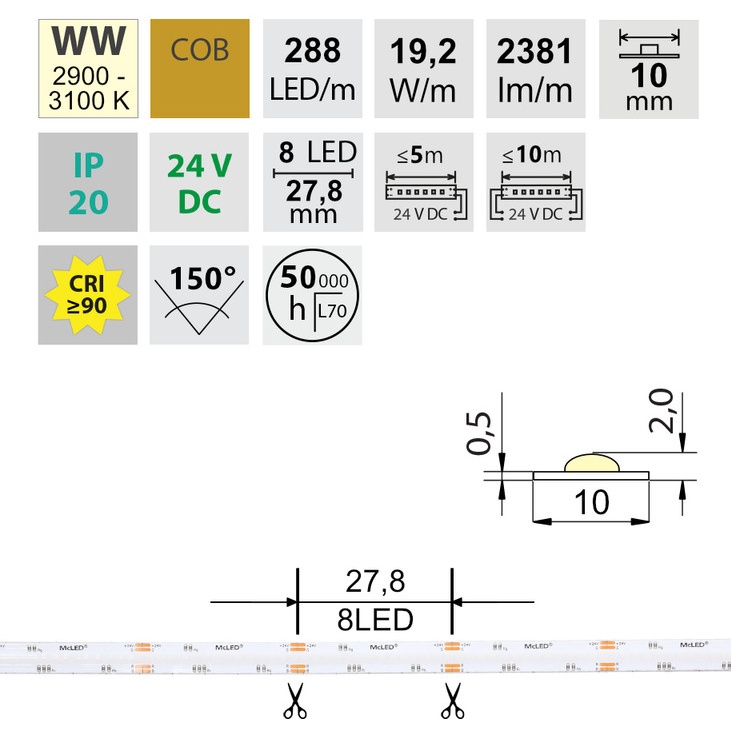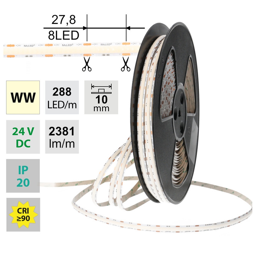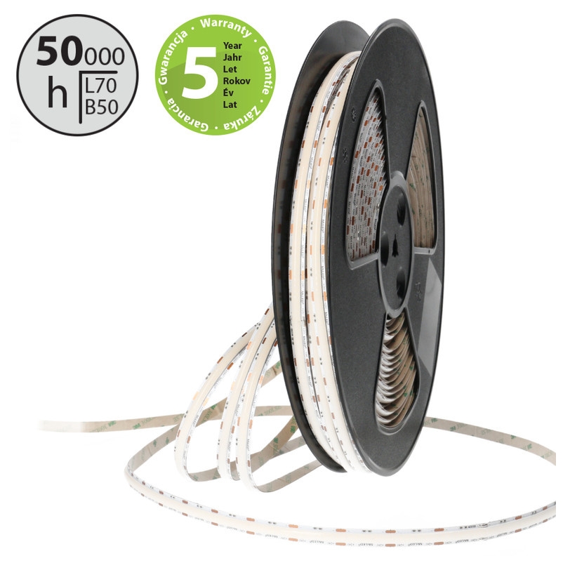 Stmívatelný LED pásek COB, teplá bílá (3000K), 19,2W, 288LED, 2381lm/m, CRI>90, segment 27,7mm, 8LED/segment, IP20, DC 24V, životnost 50000h, šíře 10mm, bílý PCB pásek, max. délka pásku při jednostranném zapojení: 5m, opatřen samolepící páskou 3M, UV stabilní. Balení 50m