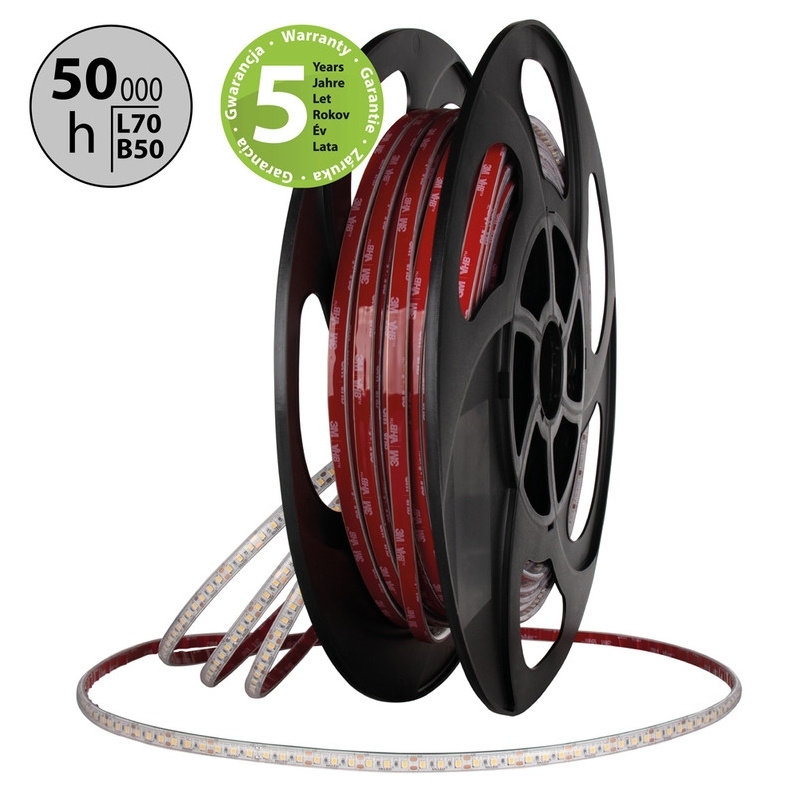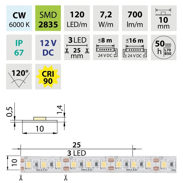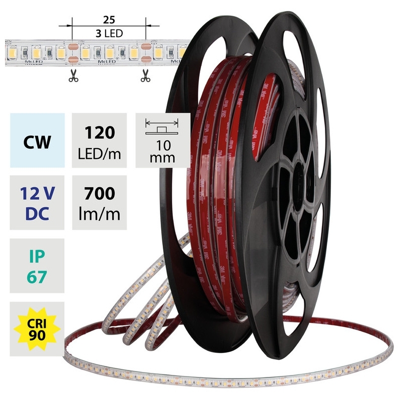 LED pásek SMD2835, studená bílá (6000K), 7,2W, 120LED, 700lm/m, CRI>90, segment 25mm, 3LED/segment, IP67, DC 12V, životnost 50000h, šíře 10mm, bílý PCB pásek, max. délka pásku při jednostranném zapojení: 5m, opatřen samolepící páskou 3M, UV stabilní. Balení 5m.