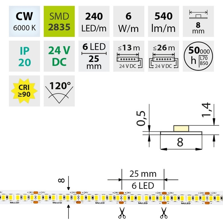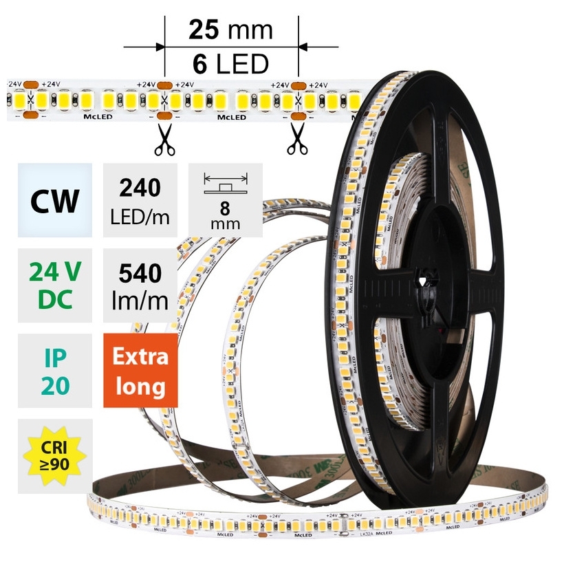 Stmívatelný LED pásek SMD2835, studená bílá (6000K), 6W, 240LED, 540lm/m, CRI>90, segment 25mm, 6LED/segment, IP20, DC 24V, životnost 50000h, šíře 8mm, bílý PCB pásek, max. délka pásku při jednostranném zapojení: 13m, opatřen samolepící páskou 3M, UV stabilní. Balení 5m.
