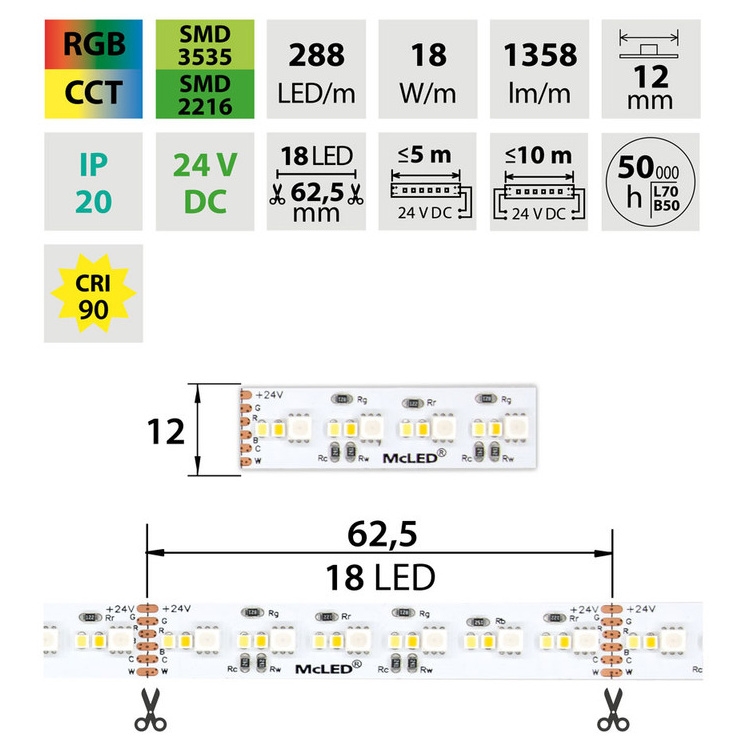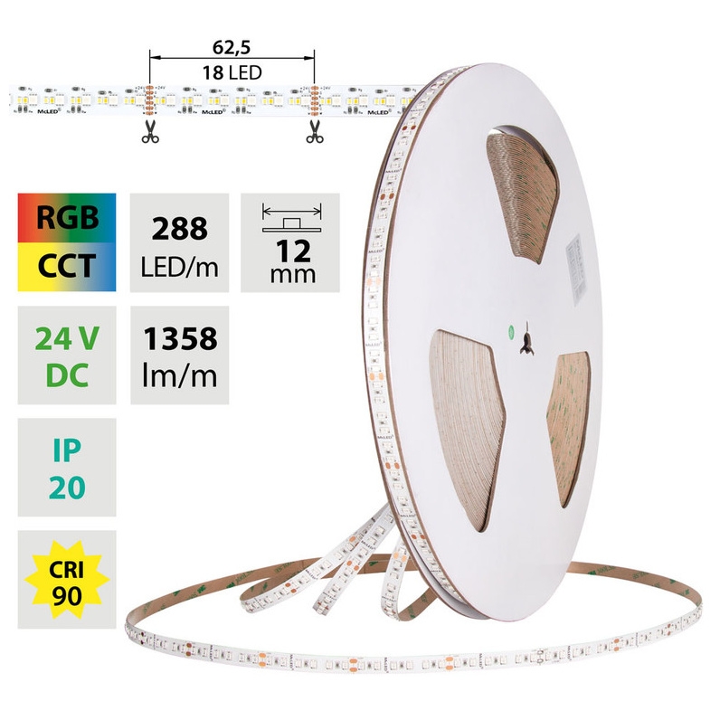 LED pásek SMD3535+2216 RGB + CCT, 288LED/m, 18W/m, DC24V, 1358lm/m, IP20, 12mm, 50m