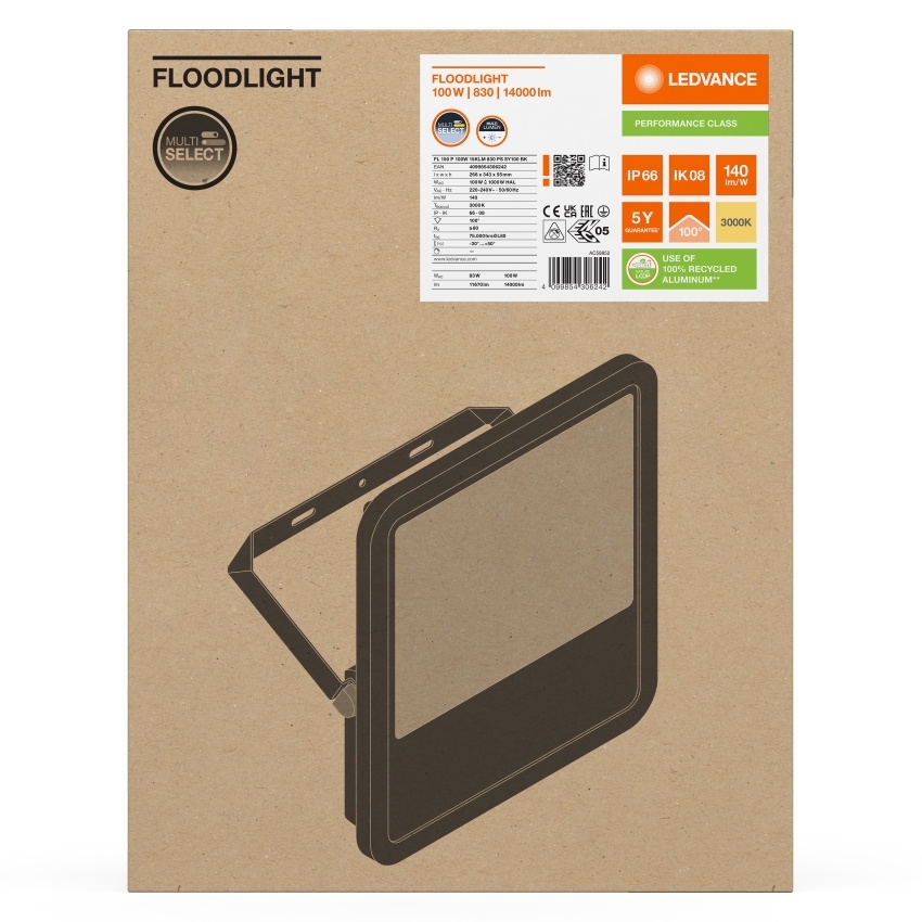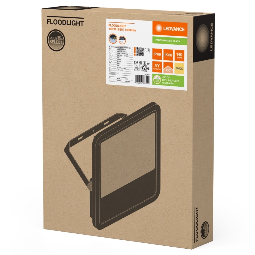 Všestranný reflektor se světelným výkonem až 15 000 lm. Vlastnosti výrobku: Vysoká světelná účinnost: až 150 lm/W. Stupeň krytí: IP66. Předinstalovaný flexibilní 1m kabel (H05RN-F), 3 × 1,0 mm? jednotlivé vodiče, obalené. Symetrické vyzařování na základě technologie reflektorů s úhlem vyzařování 100° × 100°. Montážní konzola s 30° úhlem a širokou rotační plochou. Výhody výrobku: Prodyšná membrána pro optimální výměnu vzduchu, bez dopadu na stupeň krytí IP. Vysoce univerzální díky volitelným stupňům výkonu (Multi Lumen) na krytu. Robustní kabelová průchodka s integrovanou funkcí vodotěsnosti. Bezpečné a velmi rovnoměrné osvětlení díky difuzoru s matným a tvrzeným sklem. Jasné, robustní a odolné. Úspora energie až 90 % ve srovnání s halogenovými reflektory. Nulová hodnota horní účinnosti svítidla (ULOR 0 %) při montáži v náklonu 0°. Oblasti použití: Náhrada za reflektory s halogenovými žárovkami. Venkovní použití (IP66). D-značky podle EN 60598-2-24 pro komerční jednotky s nebezpečím požáru, např. kvůli hromadění prachu. Veřejné prostory. Fasády budov. Stavební plochy. Parkoviště.