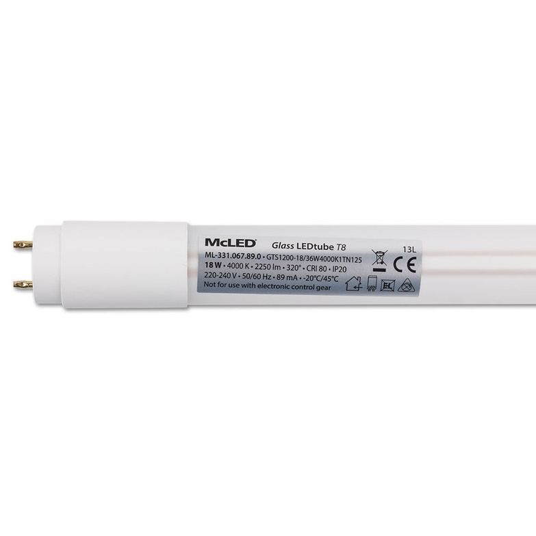 Úsporná LED trubice McLED® s příkonem pouze 18 W svým vzhledem, délkou (1198 mm) i výkonem nahrazuje klasickou fluorescenční trubici o příkonu 36 W (celkový světelný tok je 2250 lm). Tuto LED trubici s paticí G13 je možné připojit na napětí 220 - 240 V (AC).