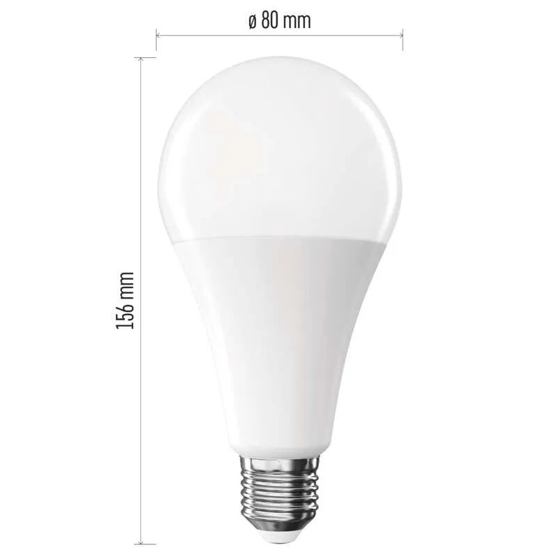LED žárovka EMOS ZQ5E84 s paticí E27 je efektivní alternativou k tradičním 150W žárovkám. Při příkonu 20 W poskytuje vysoký světelný tok 2 452 lm a výrazně snižuje spotřebu energie až o 80 %. Vyzařuje studené bílé světlo (6 500 K), ideální pro pracovní prostory či kanceláře.