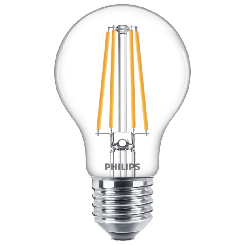 LED žárovka Philips CorePro LEDbulb typu filament v tradičním tvaru čiré skleněné baňky CL A60 s viditelnými rovnými klasickými vlákny, které zvýrazňují retro styl, je určena pro svítidla s paticí E27. Vyzařuje úsporné příjemné teplé bílé světlo 2700 K.