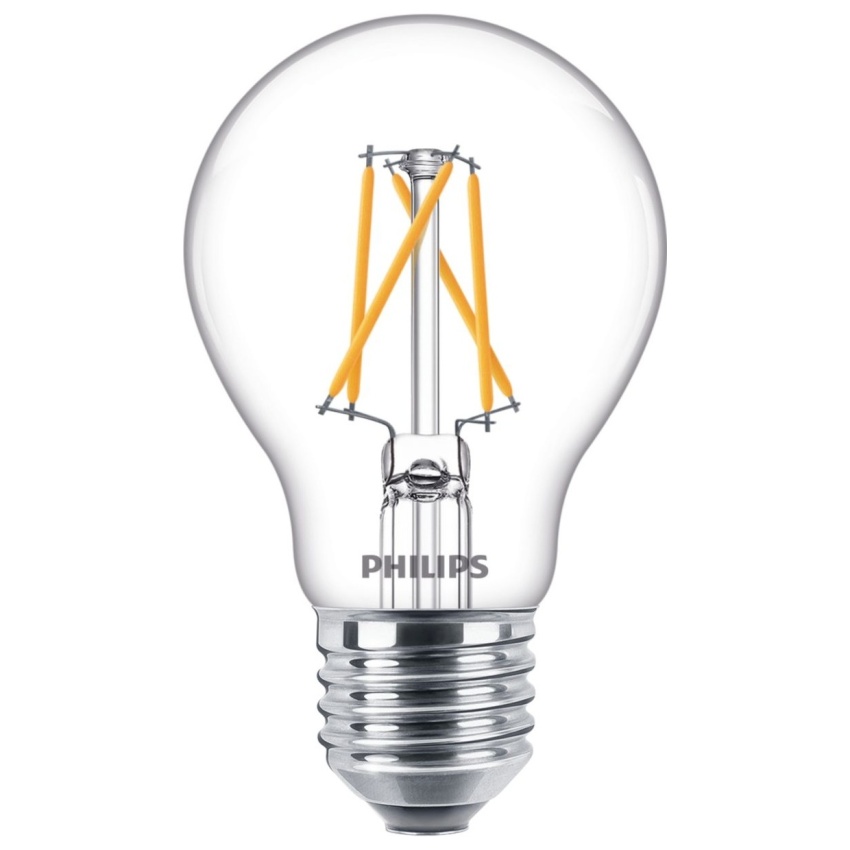 LED žárovka Philips Classic Scene Switch s paticí E27 o příkonu 7,5 W/3 W/1,6 W je ekvivalentní náhradou obyčejné 60 W/30 W/16 W žárovky podle teploty barvy bílého světla 2700 K/2500 K/2200 K, kterou snadno přepínáte standardním nástěnným vypínačem.