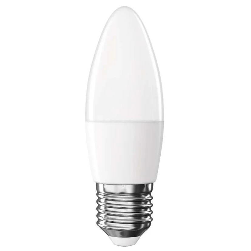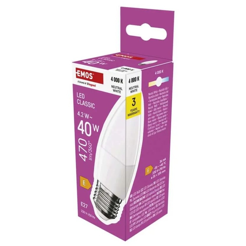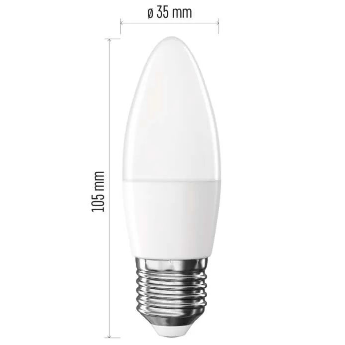 LED žárovka EMOS Classic ve tvaru svíčky s paticí E27 a příkonem 4,2 W nahrazuje klasickou 40W žárovku. Poskytuje světelný tok 470 lm s neutrální bílou barvou světla (4000 K), ideální pro domácí i komerční osvětlení. Úsporná a efektivní technologie LED zajišťuje dlouhou životnost a nižší spotřebu energie.