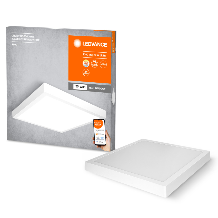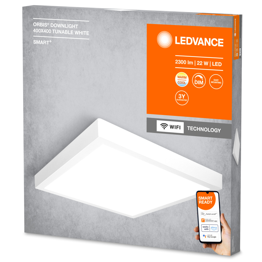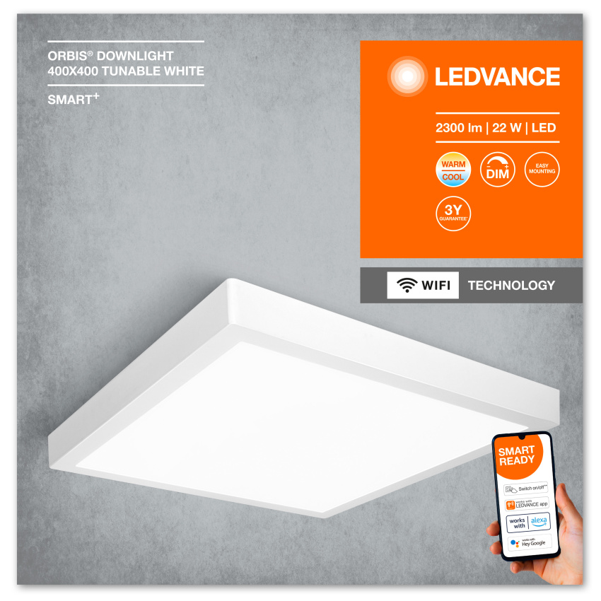Chytré, povrchové svítidlo s integrovaným předřadníkem, TW, stmívatelné. Vlastnosti výrobku: Ovladatelné pomocí aplikace LEDVANCE SMART+ (minimálně Android 8.0 nebo iOS 14.0). Možnost hlasového ovládání: Google Assistant nebo Amazon Alexa. Nastavitelná teplota chromatičnosti pomocí laditelné bílé: 3000…6 500 K. Stmívatelné. Síťový protokol: WIFI. Materiál korpusu: kov. Výhody výrobku: Přisazený downlight. Oblasti použití: Použití uvnitř. Chodby, vstupy, schodišťě, obývací pokoje, suterény. Ložnice. Kuchyně. Výbava / příslušenství: Pro ovládání pomocí aplikace LEDVANCE SMART+ je zapotřebí chytrý telefon nebo tablet (minimálně Android 8.0 nebo iOS 14.0). Včetně kompletního příslušenství pro montáž a zapojení.