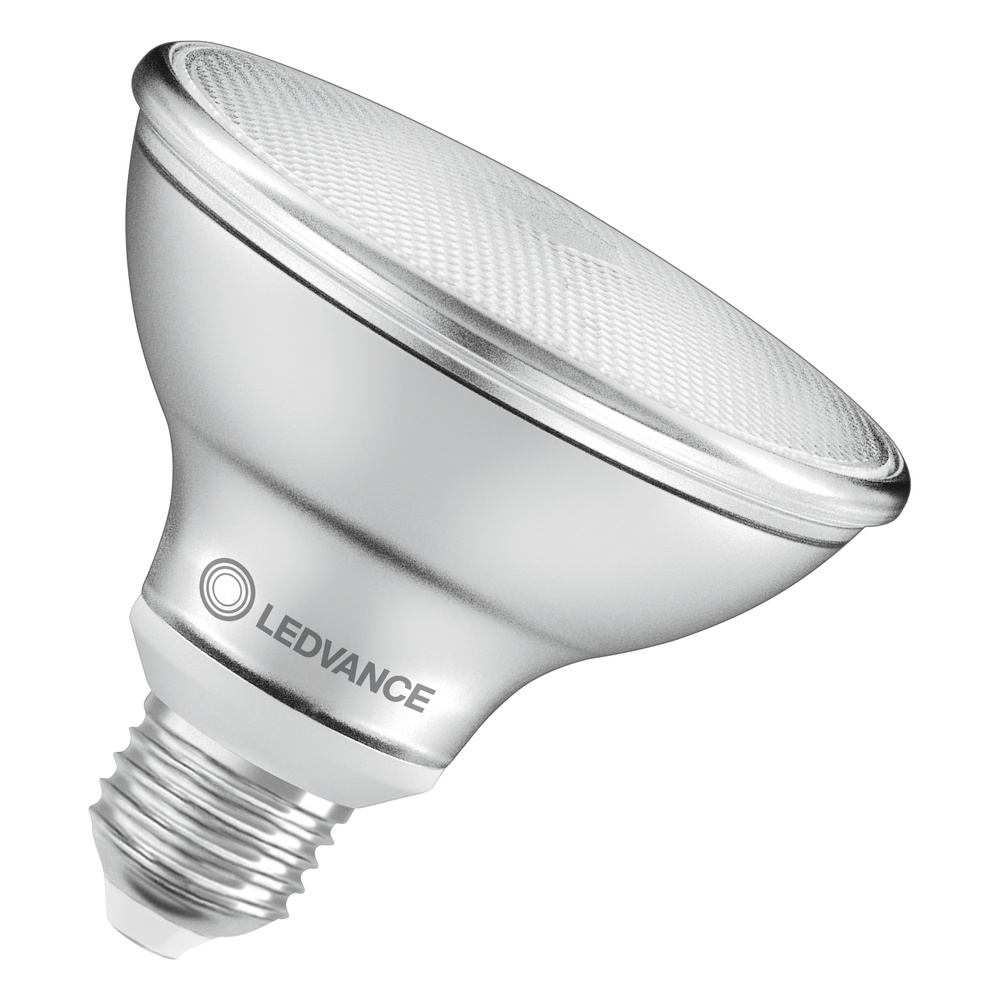 Stmívatelné reflektorové světelné zdroje LED PAR30 s šroubovací paticí. Vlastnosti výrobku: LED alternativa k vysokonapěťovým halogenovým světelným zdrojům. Vysoká konzistence barev: ? 6 SDCM. Stmívatelné. Patice: E27. Světelný zdroj je vyroben ze skla. Velmi vysoké podání barev (R<sub>a</sub>: 90). Životnost: až 25000 h. Výhody výrobku: Rychlá, snadná a bezpečná výměna bez přepojování. Design, rozměry, světelný tok srovnatelné s žárovkou nebo halogenovou žárovkou. Nízké náklady na údržbu díky dlouhé životnosti. Žádné UV a nízké infračervené záření ve světelném kuželu. Plynulé stmívání. Velmi vysoká kompatibilita stmívače, viz také <a href="http://www.ledvance.com/dim">www.ledvance.com/dim</a>. Okamžitě 100% světla, bez náběhu. Oblasti použití: Prodejny a výstavní prostory. Domácí použití. Komerční použití. Zvýrazňující osvětlení. Pouze pro vnitřní použití, nevhodné pro venkovní použití.