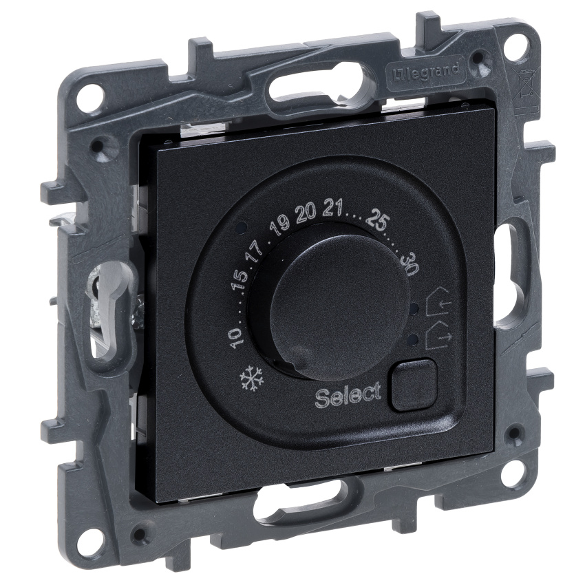 Pokojový termostat černý nové řady výrobce Legrand.