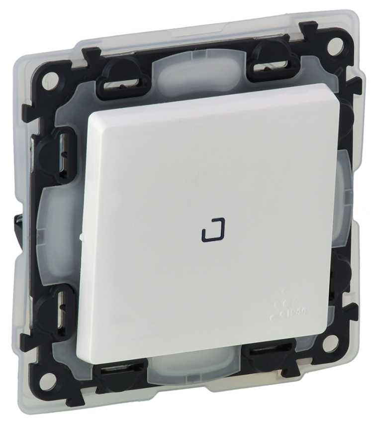 Spínač ř.1 s orientačním podsvětlením IP 44, bezšroubový v bílé barvě. 10AX-250 V AC