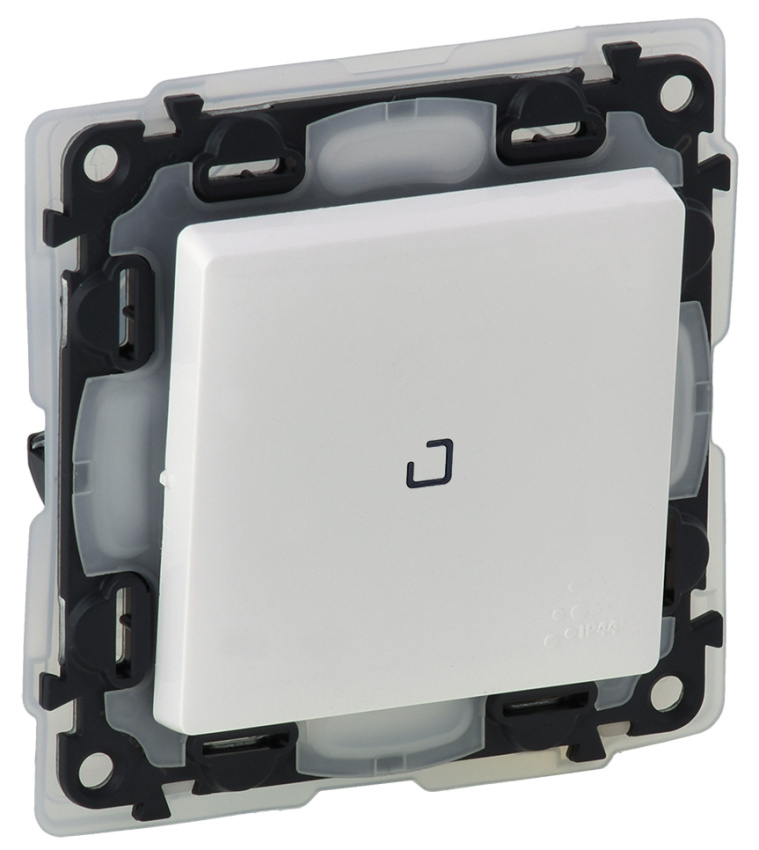 Střídavý Přepínač ř.6 s orientačním podsvětlením IP 44, bezšroubový v bílé barvě. 10AX-250 V AC