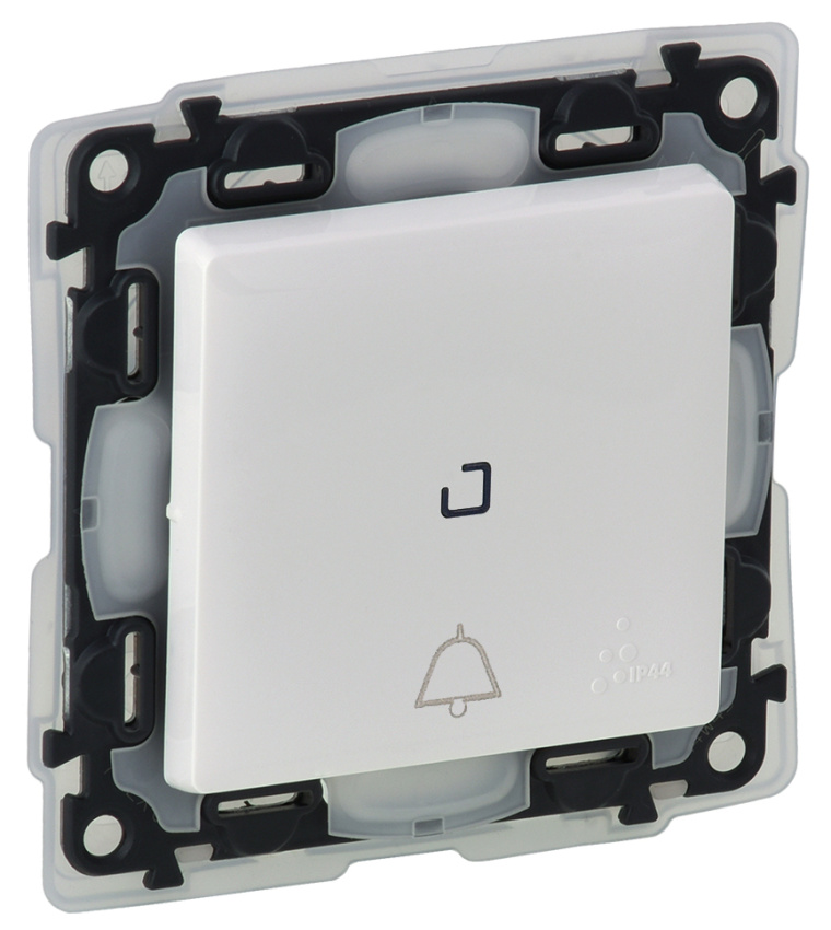 Tlačítko s přepínacím kontaktem, orientačním podsvětlením a symbolem zvonku IP 44, bezšroubové v bílé barvě. 6A-250V∿