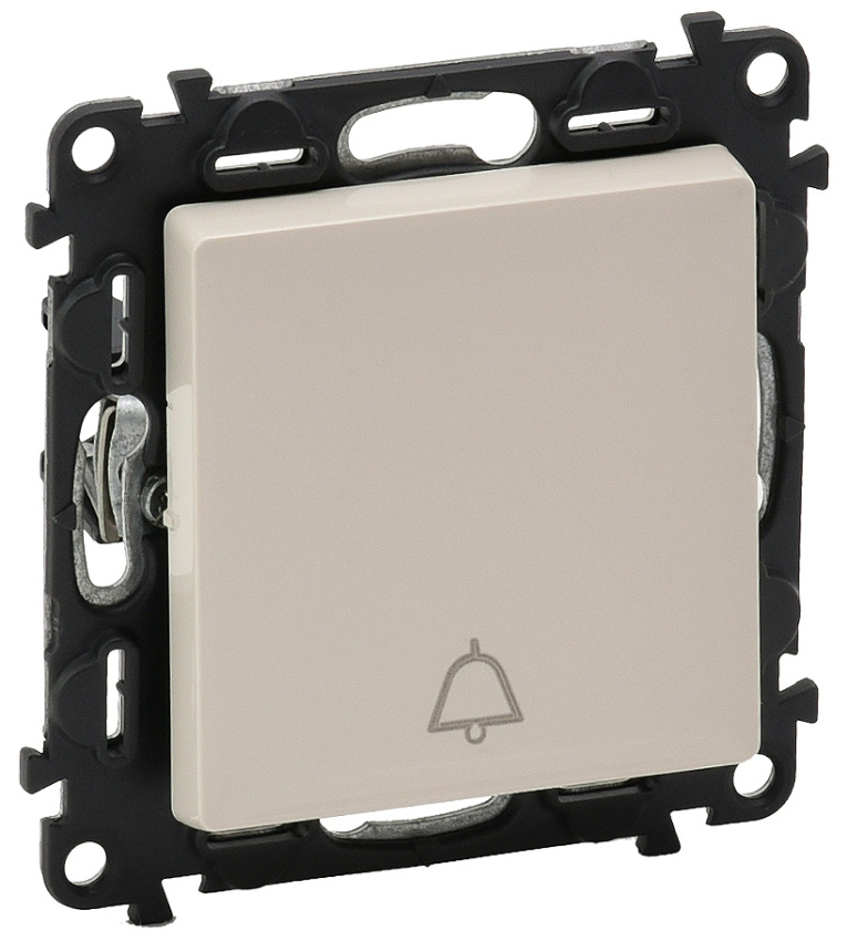 Tlačítko s přepínacím kontaktem a symbolem zvonku, bezšroubové v béžové barvě. 6A-250V AC