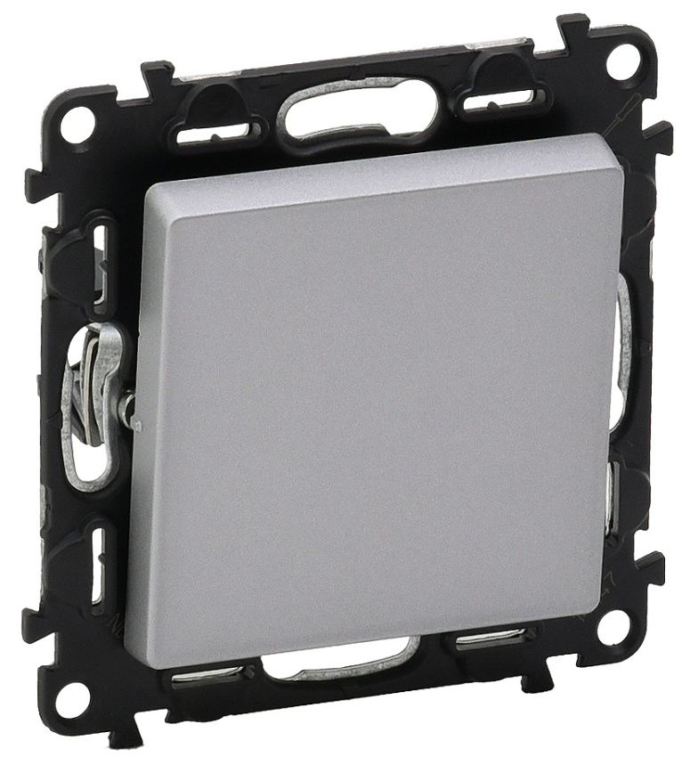 Spínač ř.1, kolébkový, bezšroubový ve stříbrné barvě. 10 AX, 250 V AC