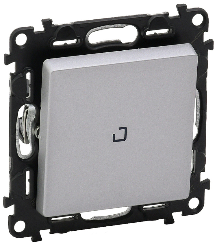 Spínač ř.1 se signalizačním podsvětlením, kolébkový, bezšroubový ve stříbrné barvě. 10 AX, 250 V AC