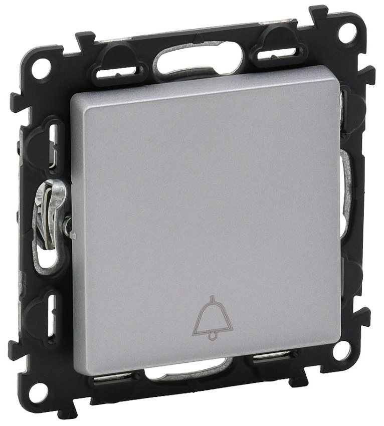 Tlačítko s přepínacím kontaktem a symbolem zvonku, bezšroubové ve stříbrné barvě. 6A-250V AC