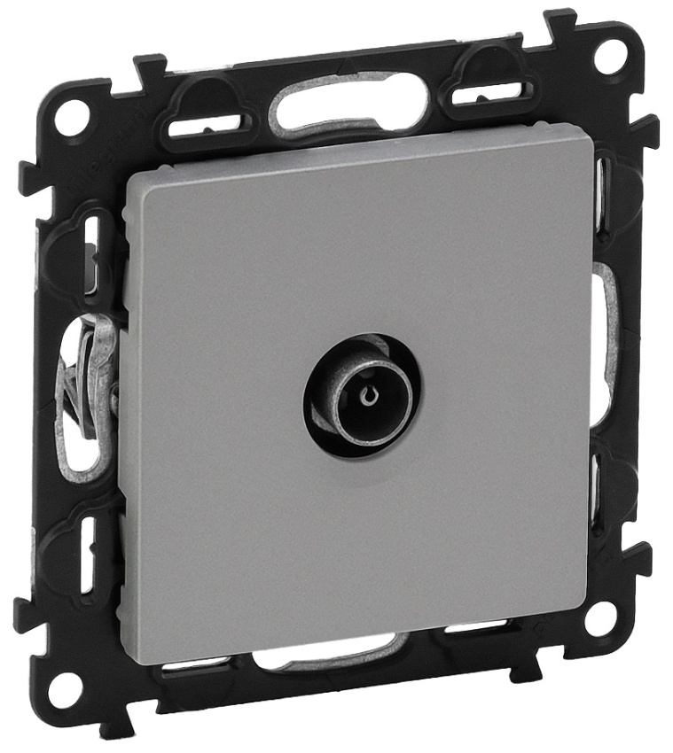 Zakončovací zásuvka TV, ve stříbrné barvě.