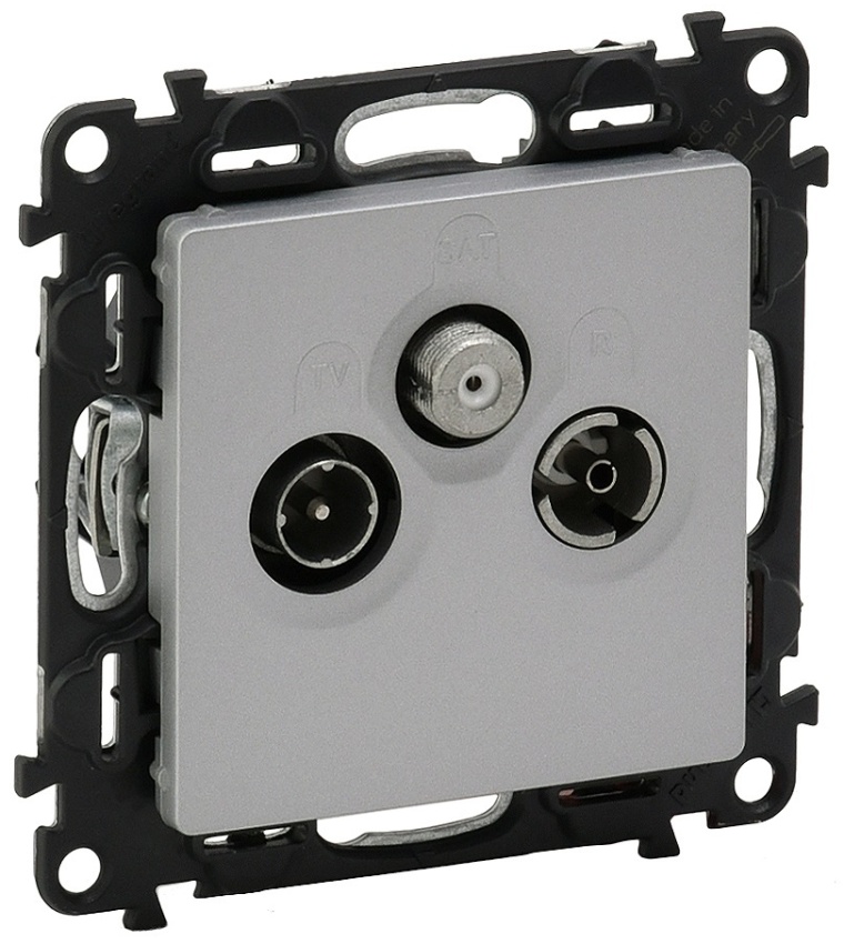 Zakončovací zásuvka TV-RD-SAT, ve stříbrné barvě.