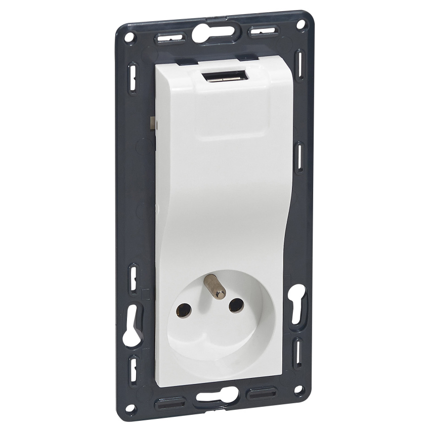 Zásuvka 2P + T s USB nabíječkou, v bílé barvě.