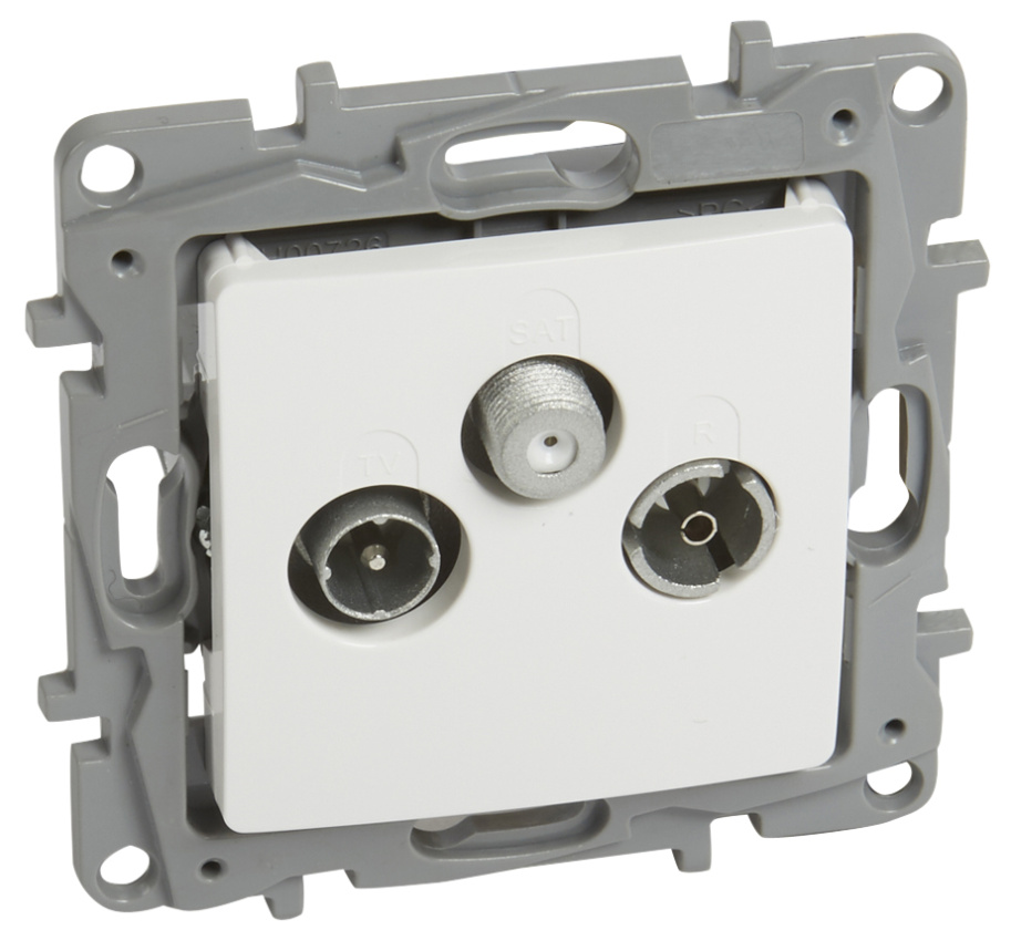 Zásuvka TV-RD-SAT průběžná, v bílé barvě.