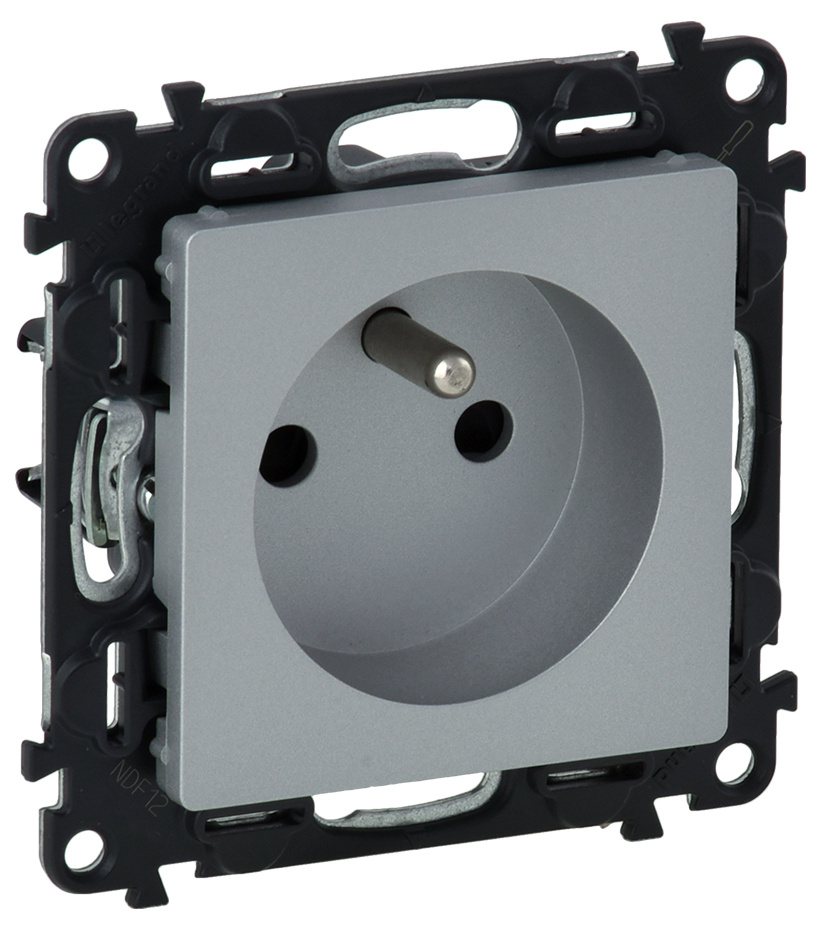 Zásuvka 2P + T s přepěťovou ochranou III st. třídy D, s dětskou ochranou, bezšroubová, ve stříbrné barvě. 16 A - 250 V AC