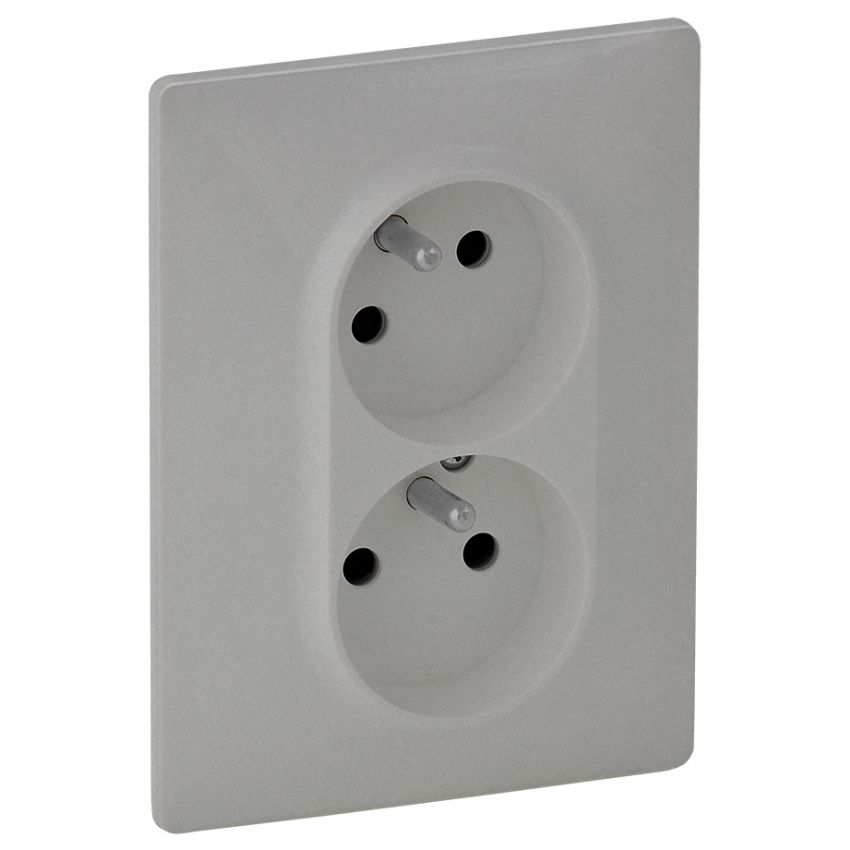 Dvojzásuvka 2x 2P + T s přepěťovou ochranou III st. třídy D, s dětskou ochranou, bezšroubová, ve stříbrné barvě. 16 A - 250 V AC