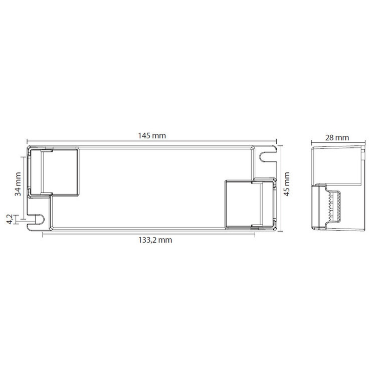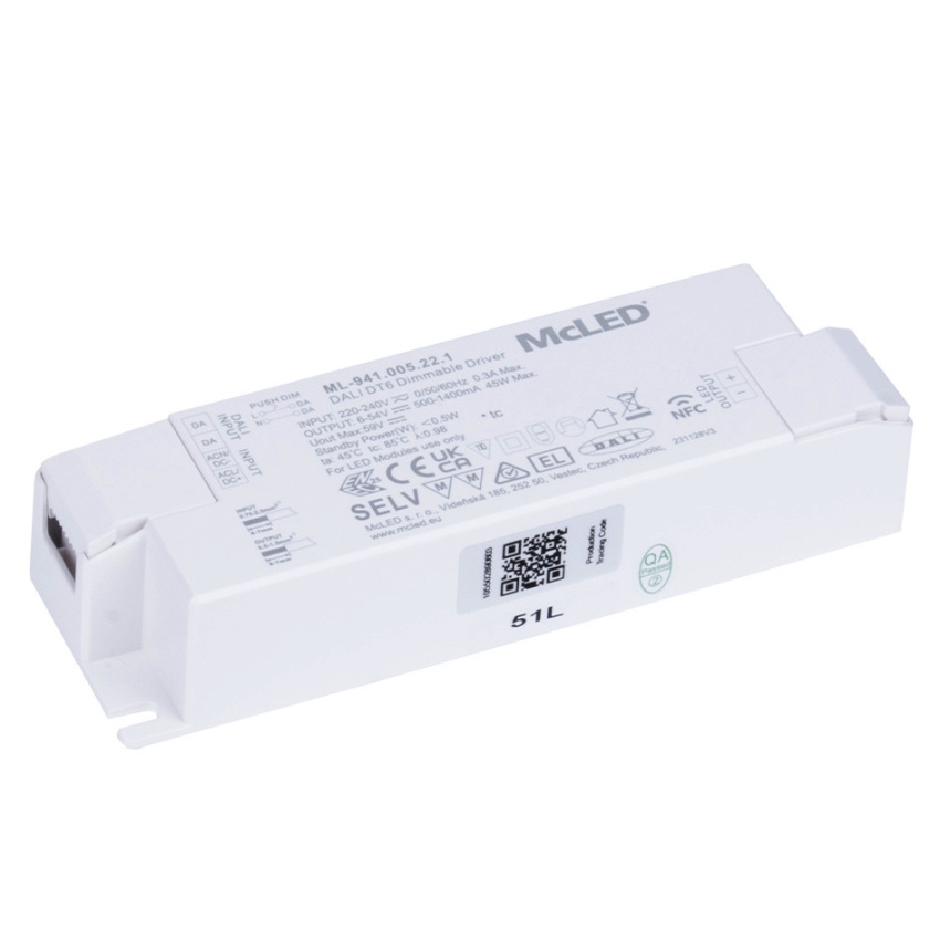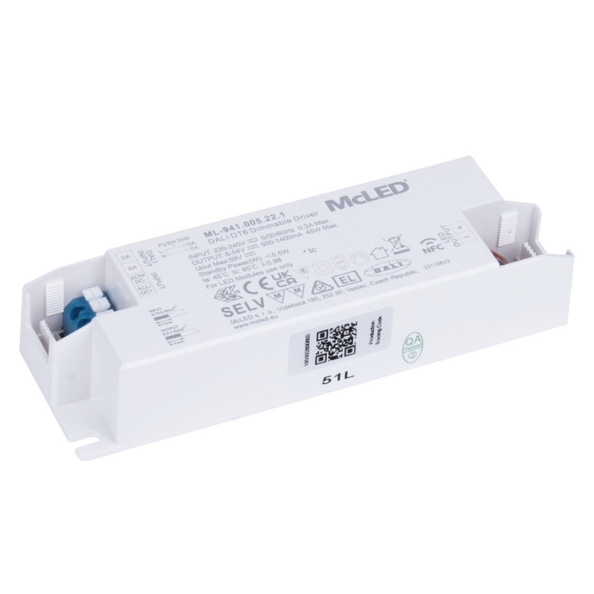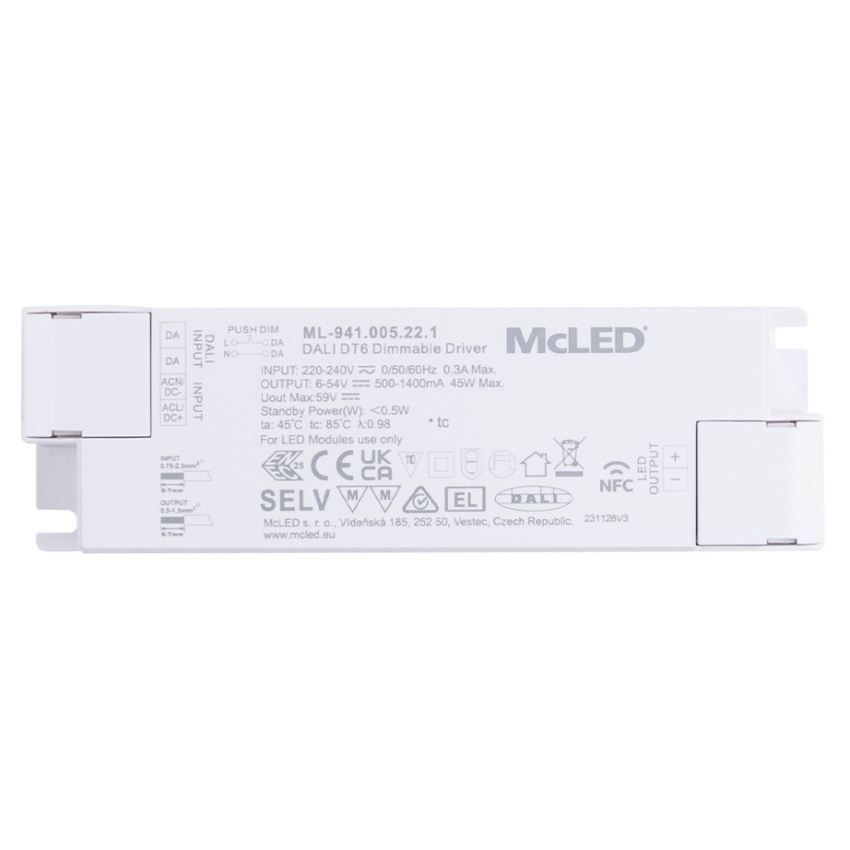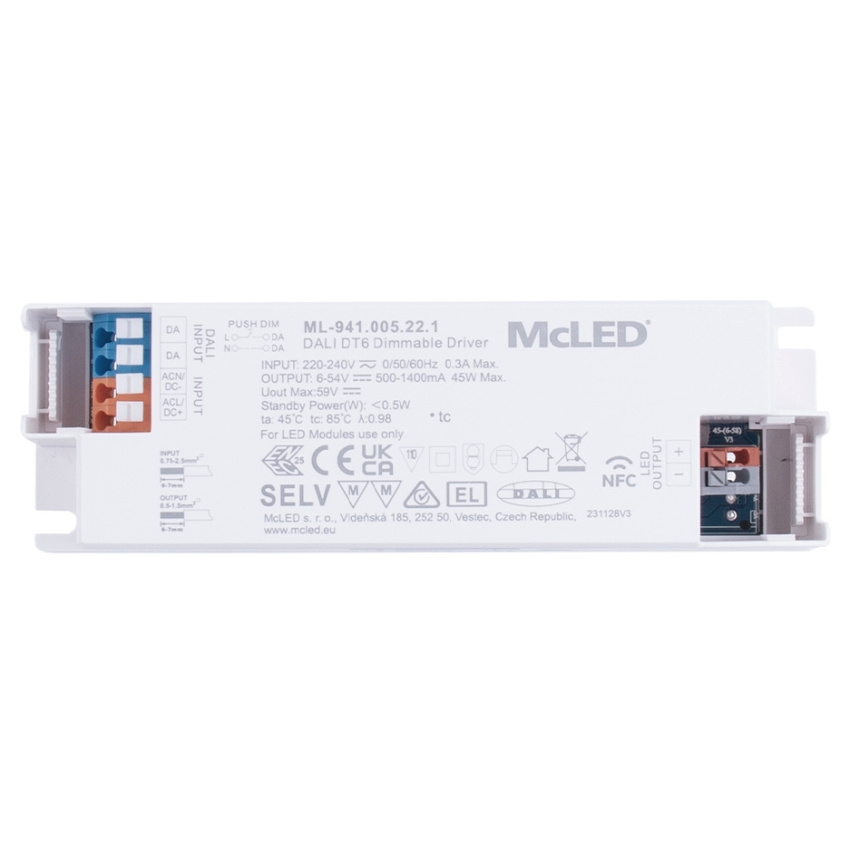 Stmívatelný zdroj konstatního proudu. Stmívání pomocí systému DALI nebo tlačítkem (push-dim), zdroj je vhodný ke stmívání svítidel McLED o výkonu do 45W. Programovatelný pomocí NFC a aplikace SR NFC TOOL. Rozměry driveru: 145x45x28mm, nastavitelný výstupní proud 500-1400mA, napětí DC 6-54V, výkon 45W. Vstupní napětí 220-240VAC. Certifikace: CE, ENEC, SELV, MM.