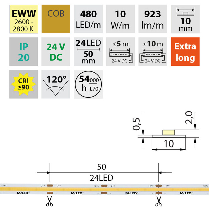 Stmívatelný LED pásek COB, extra teplá bílá (2700 K), 10 W, 480 LED, 923 lm/m, CRI>90, segment 50 mm, 24 LED/segment, IP20, DC 24 V, životnost 54000 h, šíře 10 mm, bílý PCB pásek, max. délka pásku při jednostranném zapojení: 5 m, opatřen samolepící páskou 3M, UV stabilní. Balení 50 m.
