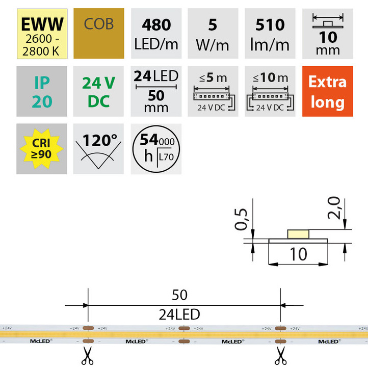 Stmívatelný LED pásek COB, extra teplá bílá (2700 K), 5 W, 480 LED, 510 lm/m, CRI>90, segment 50 mm, 24 LED/segment, IP20, DC 24 V, životnost 54000 h, šíře 10 mm, bílý PCB pásek, max. délka pásku při jednostranném zapojení: 5 m, opatřen samolepící páskou 3M, UV stabilní. Balení 50 m.