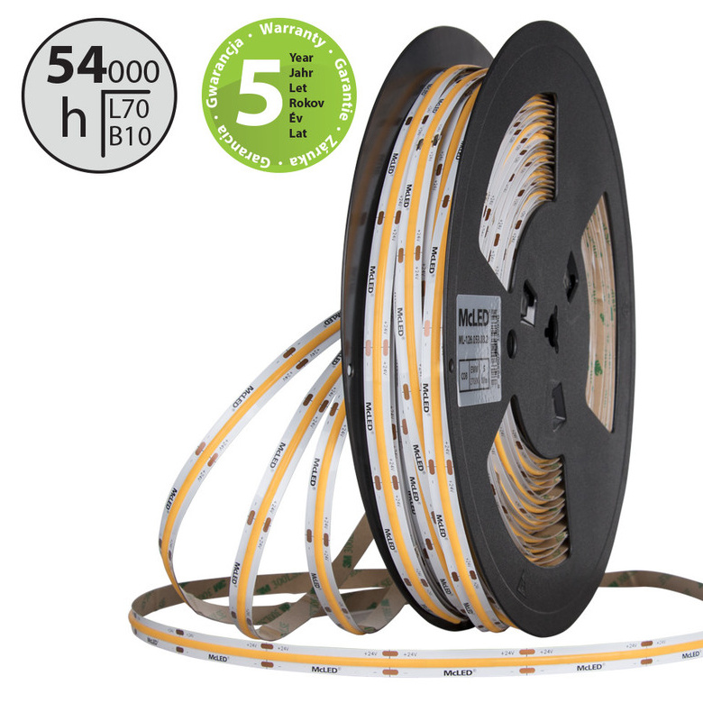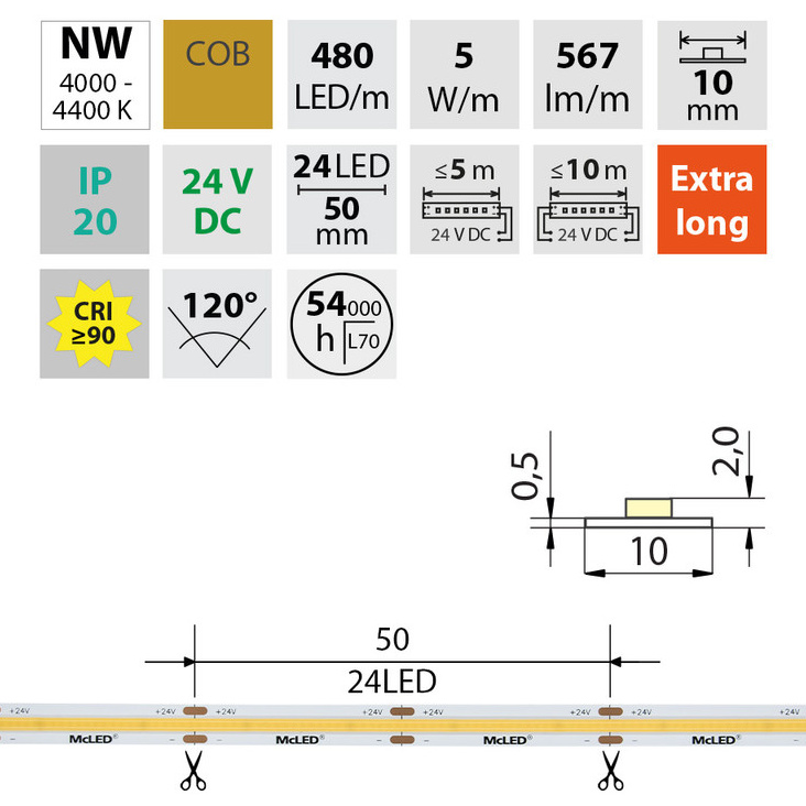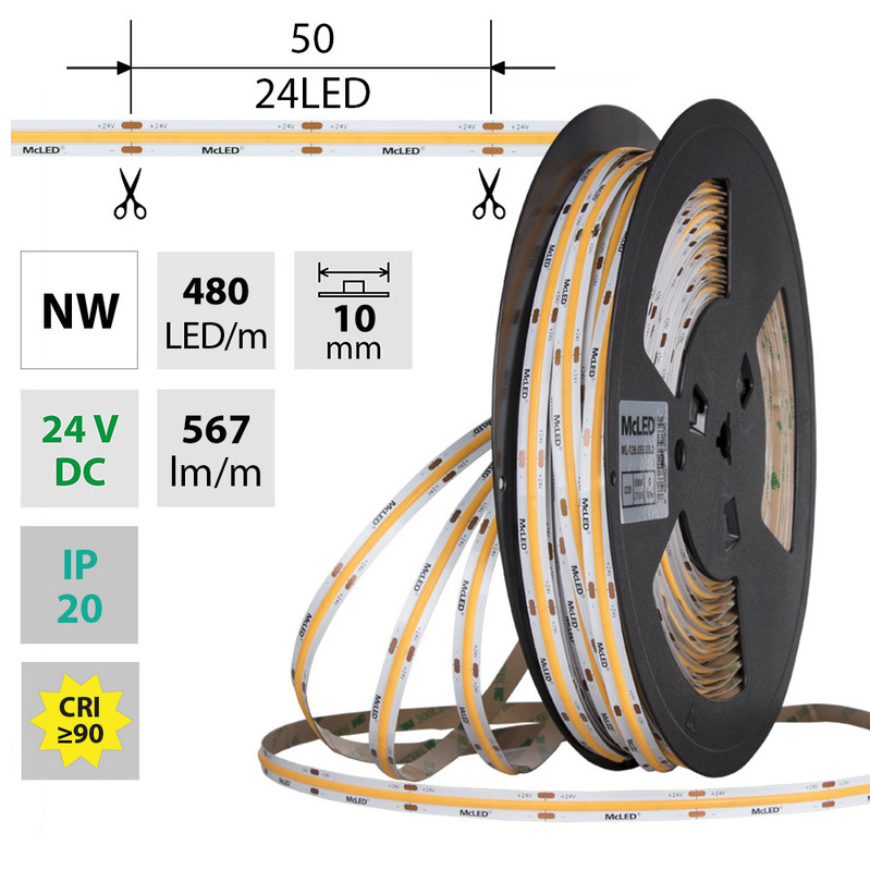 Stmívatelný LED pásek COB, neutrální bílá (4000 K), 5 W, 480 LED, 567 lm/m, CRI>90, segment 50 mm, 24 LED/segment, IP20, DC 24 V, životnost 54000 h, šíře 10 mm, bílý PCB pásek, max. délka pásku při jednostranném zapojení: 5 m, opatřen samolepící páskou 3M, UV stabilní. Balení 50 m.