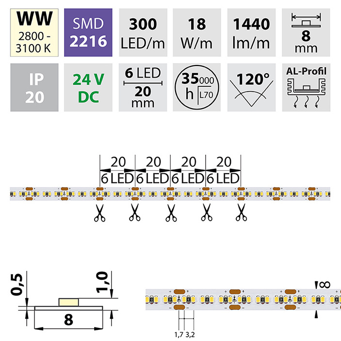 LED pásek SMD2216, 2800-3100K (teple bílý WW), 18W, 300LED, 1440lm/m, segment 20mm, 6LED/segment, IP20, DC 24V, životnost 54000h, šíře 8mm, bílý PCB pásek, max. délka pásku při jednostranném zapojení: 5m, opatřen samolepící páskou 3M, UV stabilní.