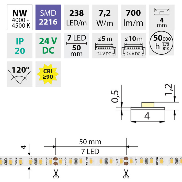 | Výkon světelného zdroje na metr | 7.2 W |