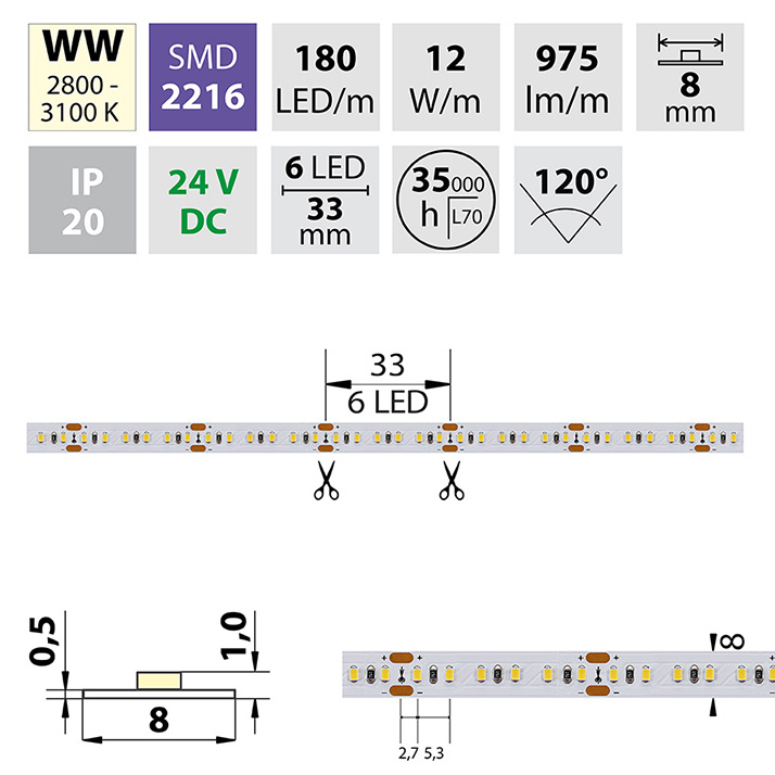 LED pásek SMD2216, 2800-3100K (teple bílý WW), 12W, 180LED, 975lm/m, segment 33,3mm, 6LED/segment, IP20, DC 24V, životnost 54000h, šíře 8mm, bílý PCB pásek, max. délka pásku při jednostranném zapojení: 5m, opatřen samolepící páskou 3M, UV stabilní.