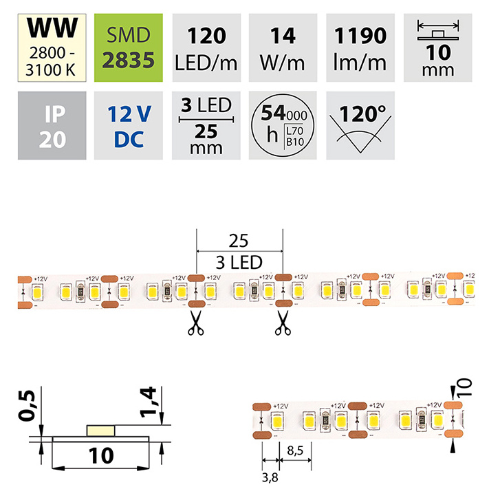 LED pásek McLED má výkon 14 W/m, svítivost 1190 lm/m a obsahuje 120 LED diod na metr. Stupeň krytí je IP20, napětí 12 V, teplota chromatičnosti je 2800 - 3100 K a životnost dosahuje 54.000 hodin. Pásek lze zkrátit až na délku 25 mm, šířka činí 10 mm. LED pásek je UV stabilní.