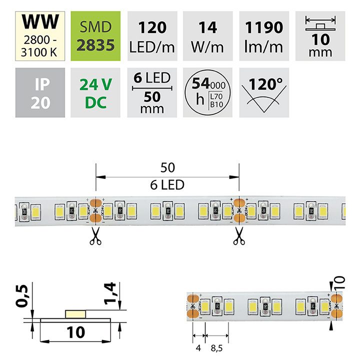 LED pásek SMD2835, 2800-3100K (teple bílý WW), 14W, 120LED, 1190lm/m, segment 50mm, 6LED/segment, IP20, DC 24V, životnost 54000h, šíře 10mm, bílý PCB pásek, max. délka pásku při jednostranném zapojení: 8m, opatřen samolepící páskou 3M, UV stabilní. Balení 5m.