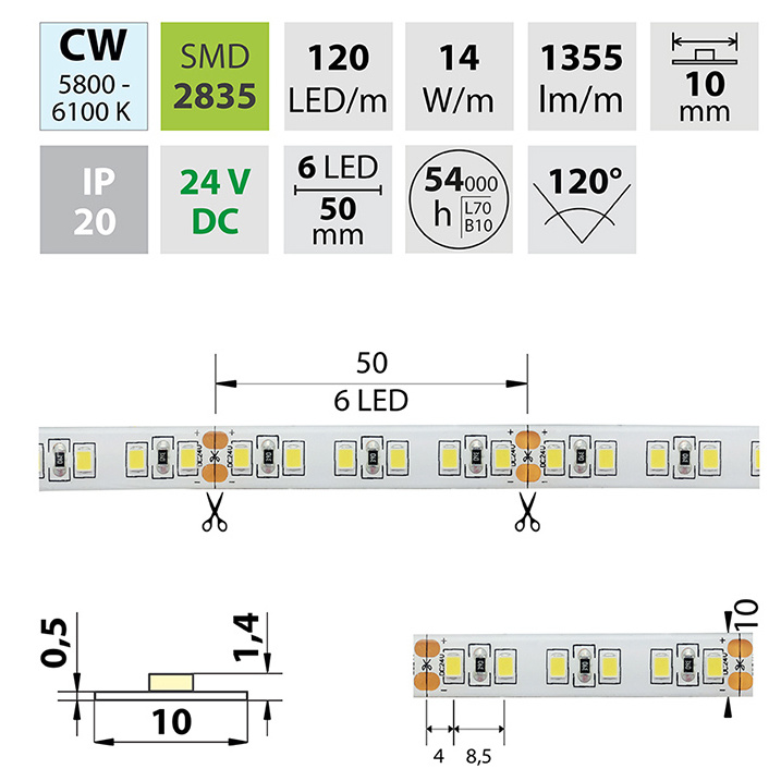 LED pásek SMD2835, 5800-6100K (studeně bílý CW), 14W, 120LED, 1355lm/m, segment 50mm, 6LED/segment, IP20, DC 24V, životnost 54000h, šíře 10mm, bílý PCB pásek, max. délka pásku při jednostranném zapojení: 5m, opatřen samolepící páskou 3M, UV stabilní. Balení 50m.