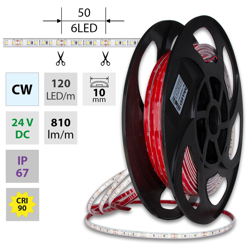LED pásek SMD2835, studená bílá (6000K), 9,6W, 120LED, 810lm/m, CRI>90, segment 50mm, 6LED/segment, IP67, DC 24V, životnost 50000h, šíře 10mm, bílý PCB pásek, max. délka pásku při jednostranném zapojení: 8m, opatřen samolepící páskou 3M, UV stabilní. Balení 50m.