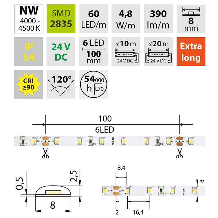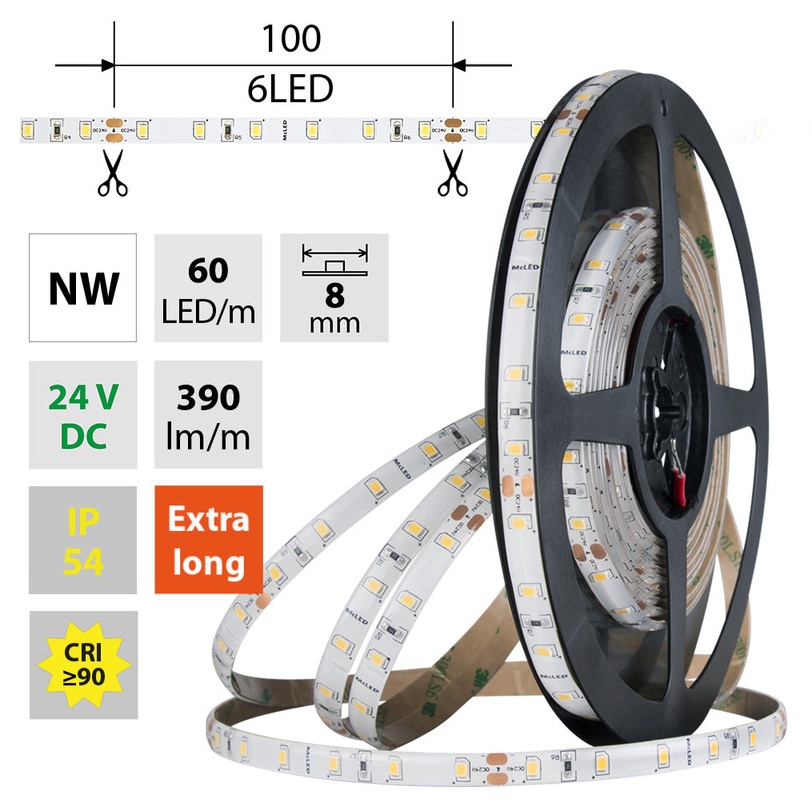 LED pásek SMD2835, neutrální bílá (4200K), 4,8W, 60LED, 390lm/m, CRI>90, segment 100mm, 6LED/segment, IP54, DC 24V, životnost 54000h, šíře 8mm, bílý PCB pásek, max. délka pásku při jednostranném zapojení: 10m, opatřen samolepící páskou 3M, UV stabilní. Balení 5m.
