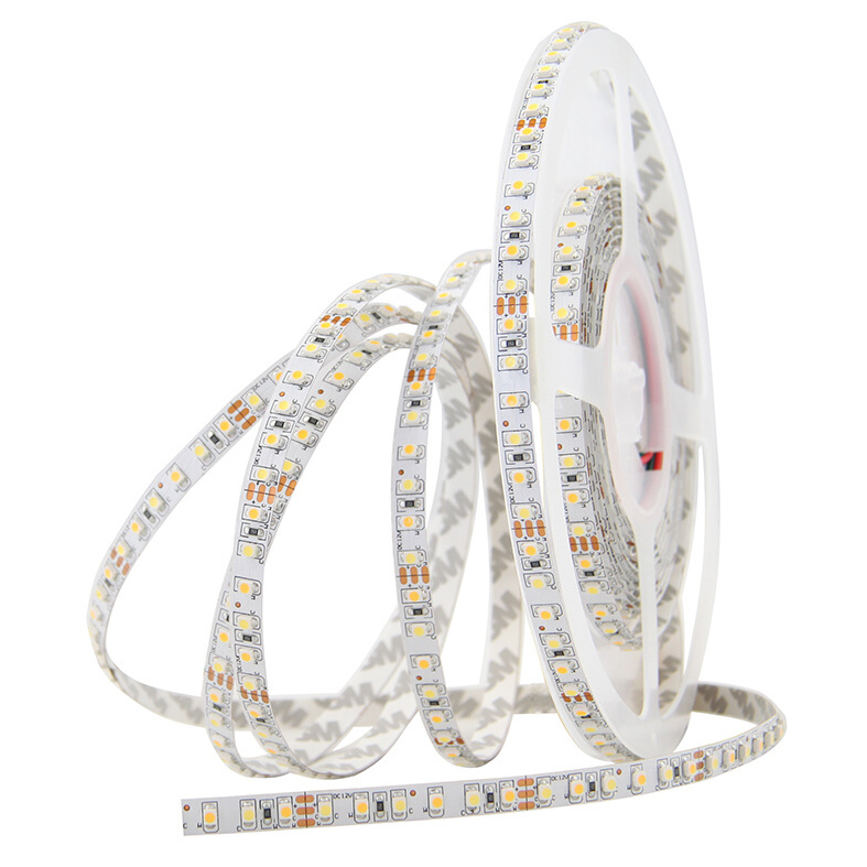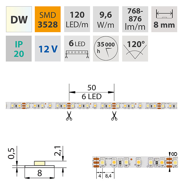 Stmívatelný LED pásek SMD3528, dual white EWW-CW (2700K+6000K), 9,6W, 120LED, 720lm/m, segment 50mm, 6LED/segment, IP20, DC 12V, životnost 54000h, šíře 8mm, bílý PCB pásek, max. délka pásku při jednostranném zapojení: 5m, opatřen samolepící páskou 3M. UV stabilní. Na pásku se střídají LED studené a teple bílé. Balení 5m.