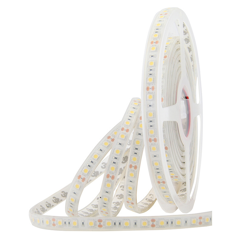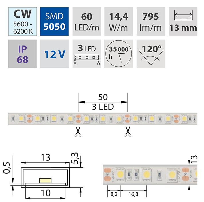 LED pásek SMD5050, studená bílá (6000K), 14,4W, 60LED, 1180lm/m, segment 50mm, 3LED/segment, IP68, DC 12V, životnost 54000h, šíře 13mm, bílý PCB pásek, max. délka pásku při jednostranném zapojení: 5m, opatřen samolepící páskou 3M. Páska pouze usnadňuje montáž, fixace pomocí spon je nezbytná.