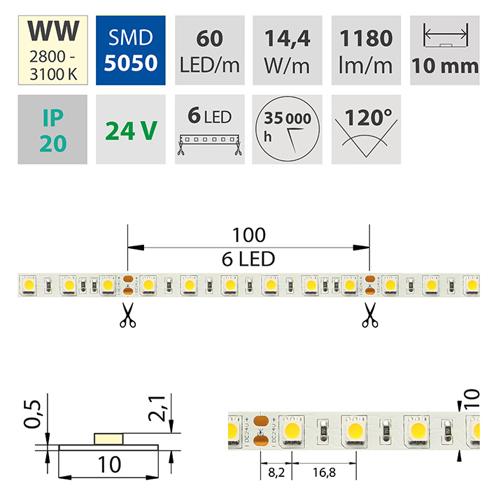LED pásek SMD5050, teplá bílá (3000K), 14,4W, 60LED, 1152lm/m, segment 100mm, 6LED/segment, IP20, DC 24V, životnost 54000h, šíře 10mm, bílý PCB pásek, max. délka pásku při jednostranném zapojení: 7m, opatřen samolepící páskou 3M.