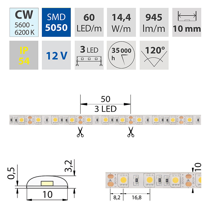 LED pásek SMD5050, studená bílá (6000K), DC 12 V, IP54, 10 mm, bílý PCB pásek, 60LED/m