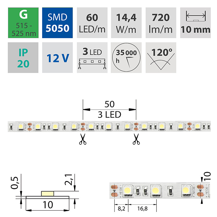 LED pásek SMD5050, studená bílá (6000K), 14,4W, 60LED, 1515lm/m, segment 50mm, 3LED/segment, IP20, DC 12V, životnost 54000h, šíře 10mm, bílý PCB pásek, max. délka pásku při jednostranném zapojení: 5m, opatřen samolepící páskou 3M.