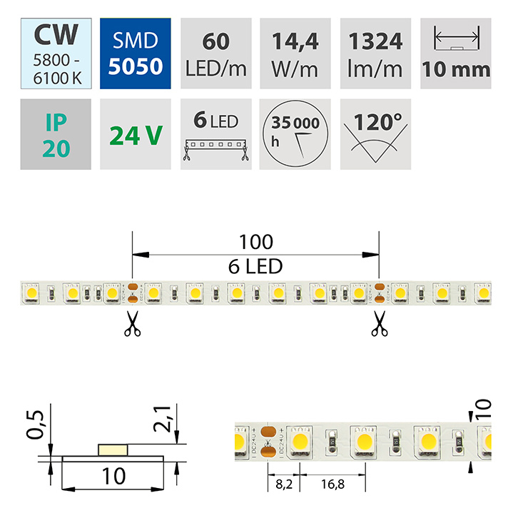 LED pásek SMD5050, studená bílá (6000K), 14,4W, 60LED, 1515lm/m, segment 100mm, 6LED/segment, IP20, DC 24V, životnost 54000h, šíře 10mm, bílý PCB pásek, max. délka pásku při jednostranném zapojení: 7m, opatřen samolepící páskou 3M.