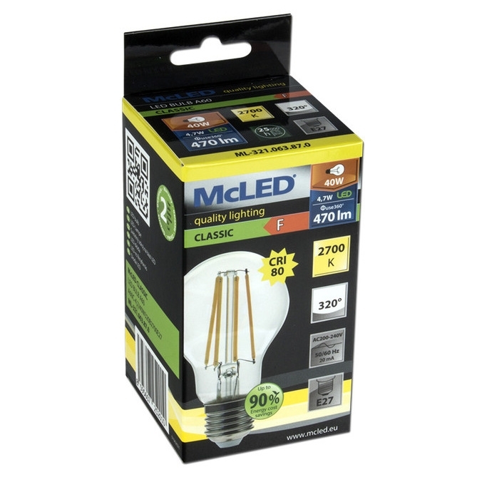 LED žárovka Classic A60 4,7W (ekvivalent 40W), patice E27, 230V, 2700K - teplá bílá, světelný tok 470lm, vyzařovací úhel 320°, CRI 80, úspora až 90%, životnost až 25.000h, 15.000 spínacích cyklů, rozměry 60 x 105 mm, nestmívatelná