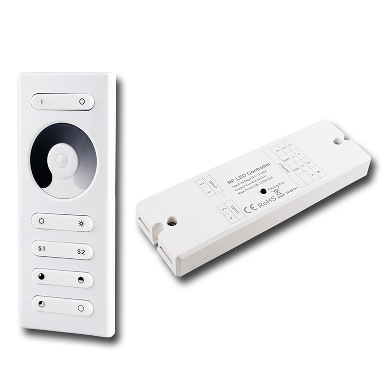 RF dálkové ovládání pro řízení jasu jednobarevných LED pásků (dosah až 20 m), 1 zóna. Možnost uložit aktuální nastavení úrovně jasu pod scény (S1, S2). Rozměry ovladače: 120×48×17,6mm (napájení 3xAAA baterie - nejsou součástí), přijímače: 145×46,5×16mm. Max. zátěž: 120W/12V, 240W/24V.