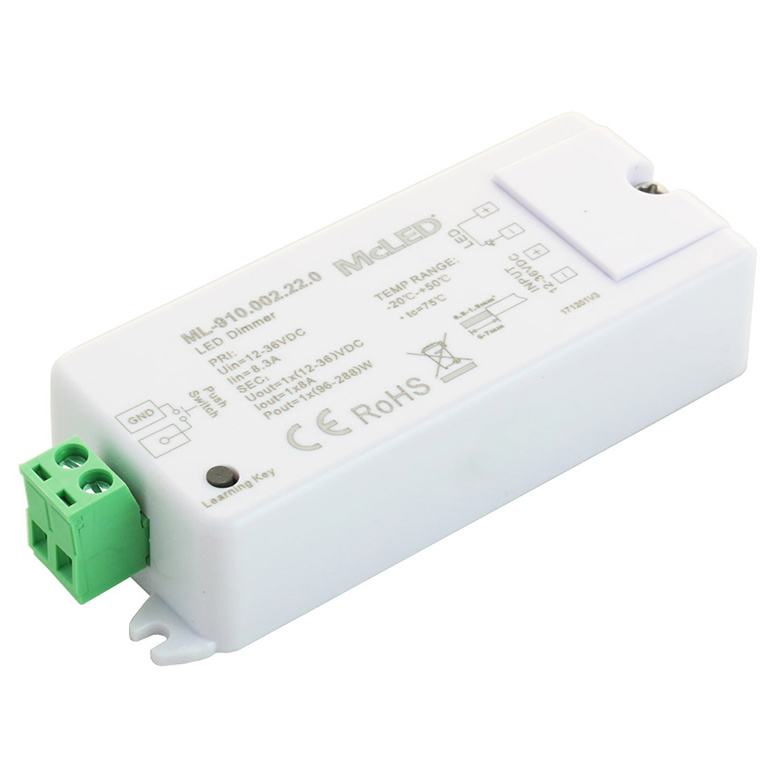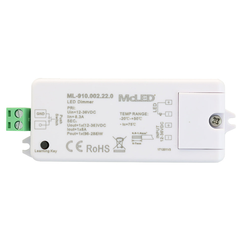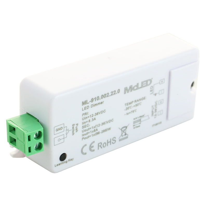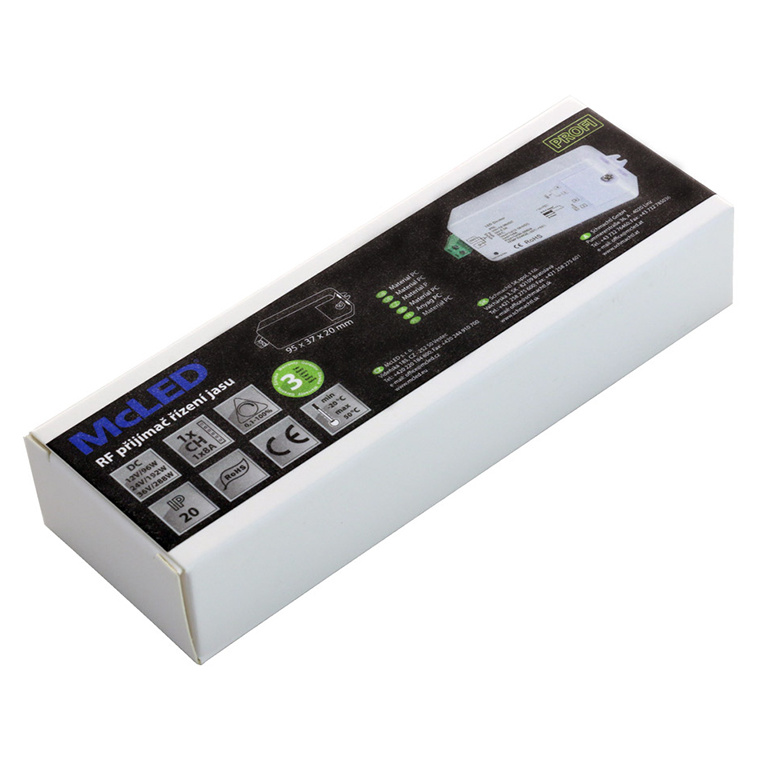 Přijímač k dálkovému RF ovladači pro řízení jasu (stmívání) jednobarevných LED pásků (ovladač není součástí). Lze ovládat také libovolným tlačítkem. Rozměry: 95x37x20mm. Vstupní napětí: DC 12-36V. Max. zátěž: 96W/12V, 192W/24V, 288W/36V. Po výpadku napájení si pamatuje poslední nastavenou hodnotu/režim.